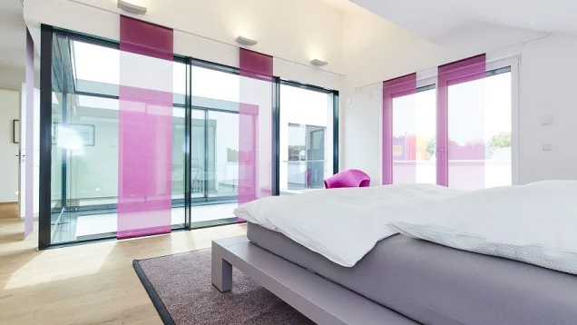 An das großzügige Hauptgebäude mit Satteldach schließt sich im Erdgeschoss der kubistische Anbau an, der vielfältige Nutzungsmöglichkeiten bietet. Durch die Teilung der Dachflächen entsteht das Herzstück des Hauses: das Atrium im Stile römischer Architektur. Bodentiefe Fenster und Schiebetüren verbinden drinnen mit draußen und sorgen für reichlich Lichteinfall. Hier trifft man sich gerne!
