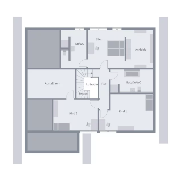 Unter dem formschönen Satteldach punktet dieses Einfamilienhaus mit viel Raum zum Wohlfühlen. Im Erdgeschoss bietet der lichtdurchflutete Wohnbereich mit seinen fast 40 m² ausreichend Platz zum Verweilen in behaglicher Atmosphäre und einen direkten Zugang zur Terrasse. In der geschlossenen Küche können sich Kreative ungestört auf die Zubereitung kulinarischer Köstlichkeiten konzentrieren und in gemütlicher Umgebung des Esszimmers genießen. Vom großen Hauswirtschaftsraum lässt sich die Garage mit zwei Stellplätzen unmittelbar erreichen. Direkt am Eingangsbereich befindet sich ein kleines Gäste-WC, anschließend führt die zentralgelegene Treppe hoch ins Dachgeschoss. Geräumige Wohnfläche, separates Bad mit Dusche und WC, angeschlossene Ankleide und Zugang zur Dachterrasse: im Schlafzimmer sind alle Voraussetzungen für individuelles Wohlbefinden vorhanden. Zwei großzügige Kinderzimmer, ein weiteres Bad mit Wanne, Dusche und WC sowie ein Abstellraum runden den Landhauswohnstil der oberen Etage ab.