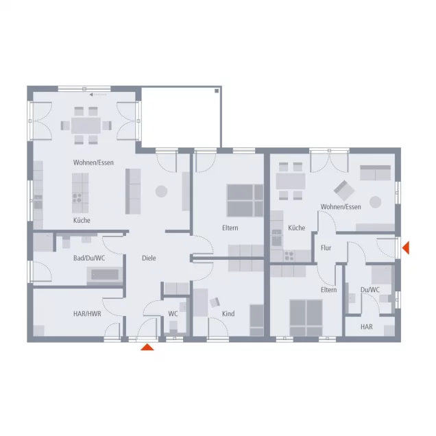 Eine Ebene, zwei Wohneinheiten, maximaler Wohnkomfort, keine Abstriche - unser Bungalow 4 erfüllt auf einer Grundfläche von knapp 170 Quadratmetern all diese Kriterien. Die Hauptwohnung bietet Raum für die kleine Familie. Von der großen Diele führt der Weg direkt in den großen Wohn-Ess-Kochbereich, der durch seinen außergewöhnlichen Grundriss besticht. Dank eines baulichen Vorsprungs ist hier eine geräumige, lichtdurchflutete Nische entstanden, in der ein großer Esstisch Platz findet. Und auch für eine Küche mit Kochinsel und für eine gemütliche Couchecke ist ausreichend Raum. Von hier geht es auch direkt auf die gemütliche Terrasse. Ebenfalls in der Hauptwohnung: das Elternschlafzimmer, ein Kinderzimmer, Hauswirtschaftsraum, Badezimmer sowie Gäste-WC. Die danebenliegende Einliegerwohnung bietet mit einem Wohn-Ess-Koch-Bereich, Schlafzimmer, Bad und Hauswirtschaftsraum Platz für Singles, Paare oder die Großeltern - kann aber auch als separates Büro genutzt werden.
