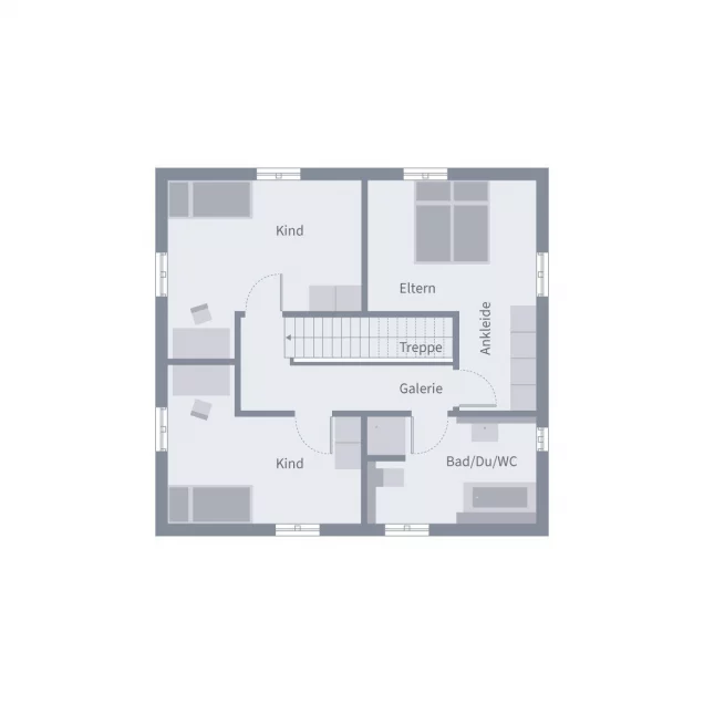 Oben erschließt ein Flur die Schlafräume gleichmäßig entlang des Weges