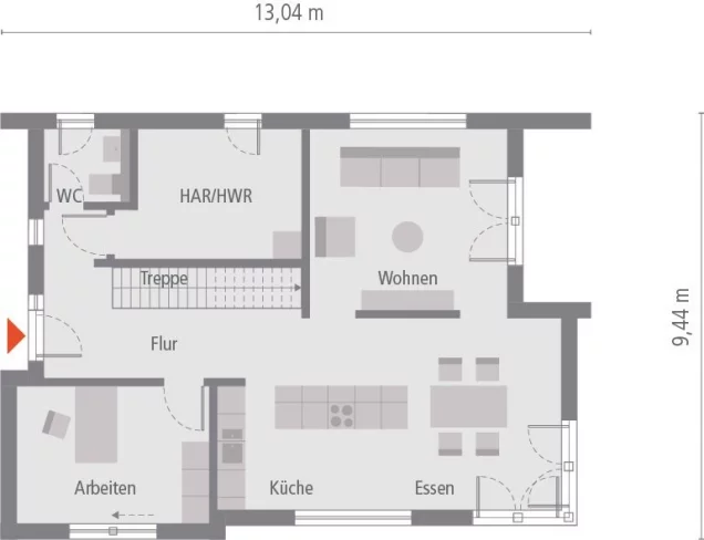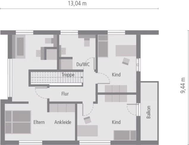Klassisch und stilvoll präsentiert sich das 2-geschossige Einfamilienhaus Design 13. Unter dem Satteldach vereinen sich moderne Architektur und höchster Wohnkomfort. Im Entrée trennt die offene Treppe WC und HWR räumlich vom restlichen Wohnbereich ab. Auch das Büro findet hier seinen Platz. Der offene und helle Koch- und Wohnbereich wird durch ein freistehendes Wandelement gekonnt unterbrochen. Vom Wohn- und Esszimmer geht es zur großflächigen Eckterrasse. Im Obergeschoss ist die Elternsuite mit Bad und Ankleide dank kluger Raumaufteilung geschickt von den Kinderzimmern mit eigenem Dusch-WC abgegrenzt. Der Dachvorsprung an der Giebelseite setzt nicht nur gestalterische Akzente, sondern sorgt auch für einen geschützten Aufenthalt im Freien.