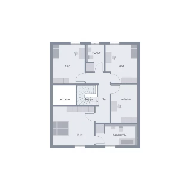Als echtes Raumwunder entpuppt sich das Design 18.2. In die rund 100 m² Fläche im Erdgeschoss ist ein Carport integriert, wodurch die künftigen Bewohner bei Wind und Wetter trockenen Fußes ins Hausinnere gelangen. Besonders praktisch: Vom Carport führt eine Tür in den Hauswirtschaftsraum, wo die Einkäufe direkt und ohne großes Schleppen verstaut werden können. Auch die Haustür liegt im Bereich des Carports. Von hier gelangt man über die großzügige Diele, vorbei am Gäste-WC, direkt zum Highlight des Hauses: in den knapp 48 m² großen Wohn-Ess-Bereich, der nicht nur großzügig bemessen ist, sondern auch mit seiner Helligkeit punktet. Viel Platz für Arbeit, Hobby und Entspannung bietet die erste Etage. Dort finden zwei Kinder Raum zum Schlafen und Spielen. Zudem gibt es zwei große Bäder: Eines wird von den beiden Kinderzimmern eingerahmt, ein weiteres schließt sich direkt ans Elternschlafzimmer an