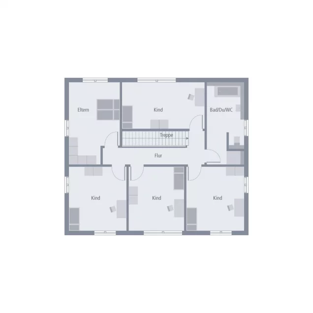 Das Design 19 ist der Traum jeder Großfamilie. Vier Kinderzimmer stehen im Obergeschoss zur Verfügung und bieten viele Möglichkeiten der Gestaltung. So können hier beispielsweise vier Schlafzimmer, aber auch eine Variante aus Schlaf- und Spielzimmer entstehen. Das Elternschlafzimmer sowie ein geräumiges Bad mit Badewanne und Dusche runden das Raumangebot in dieser Etage ab. Viele Räume, aber keine beengten Verhältnisse, denn alle Familienmitglieder haben dank der cleveren Raumaufteilung rund 16 m² Platz zum Leben, Schlafen und Entspannen. Komfortabel gestaltet sich auch das Erdgeschoss, das durch seine besondere Aufteilung besticht. In den Wohn-Ess-Bereich integriert und doch räumlich abgetrennt liegt die Küche als Mittelpunkt dieser Ebene. Das verleiht den Räumen ein ganz besonderes Flair - offen und doch gemütlich. Ein weiteres großes Zimmer, das beispielsweise für Gäste oder als Büro genutzt werden kann, ein Hauswirtschaftsraum sowie ein Gäste-WC befinden sich ebenfalls im Erdgeschoss.
