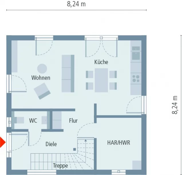 Bauherren mit geringerem Raumbedarf oder kleinem Grundstück finden mit Design 8 die perfekte Lösung. Der Satteldachklassiker in Kubusform überzeugt mit hohem Wohnkomfort und lässt keine Wünsche offen. Größe und reichlich Freiraum offeriert der im Erdgeschoss offen gehaltene Grundriss. Drinnen und draußen scheinen hier förmlich zu verschmelzen, denn gleich vier Türen ermöglichen einen direkten Zugang aus dem Wohn- in den Außenbereich. Und auch in der oberen Etage hält das Tageslicht dank bodentiefer Fenster rundum Einzug. Raumnutzung und -aufteilung sind flexibel: Schlafen, Büro, Kinder, Gäste? Alles ist möglich. Dieses projektierte Premium-Fertighaus wird für Sie in der Energieeffizienzklasse A+ nach Ihren Wünschen auf einer Bodenplatte gebaut. Natürlich ist auch der Bau eines Vollkellers, als Nutz- oder Wohnkeller, gegen Aufpreis möglich.