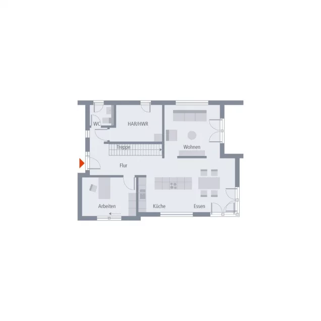 Im Entrée gliedert eine offene Treppe den Eingangsbereich und trennt WC sowie Hauswirtschaftsraum elegant vom restlichen Wohnbereich. Auch ein praktisches Büro findet hier seinen Platz. Der großzügige Koch- und Wohnbereich wird durch ein frei stehendes Wandelement raffiniert unterteilt, ohne an Offenheit zu verlieren. Vom Ess- und Wohnzimmer führt der Weg direkt auf die weitläufige Eckterrasse - ideal für entspannte Stunden im Freien.