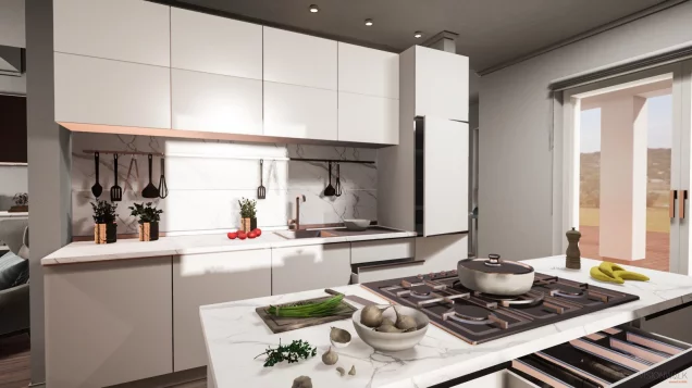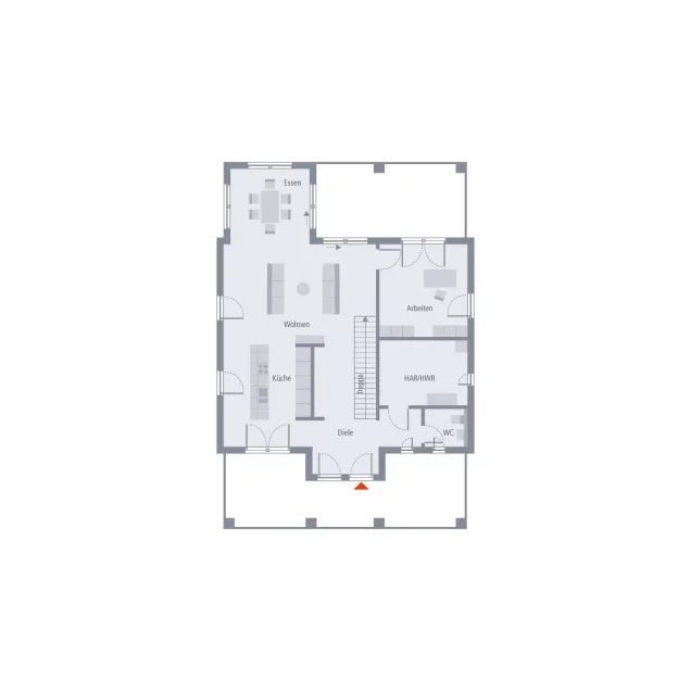 Die beiden großen Balkone an den Längsseiten laden zu lauen Sommerabenden ein. Können Sie sich vorstellen, dort zu sitzen, ein Glas Wein in der Hand und den Blick in die Ferne schweifen zu lassen? Der große, offene Wohn-Ess-Kochbereich mit Erker wird zum Herzstück Ihres Alltags, hell und freundlich. Büro, Hauswirtschaftsraum und Gäste-WC machen den Tagesablauf angenehm planbar. Möchten Sie erleben, wie Licht und Raum miteinander spielen?