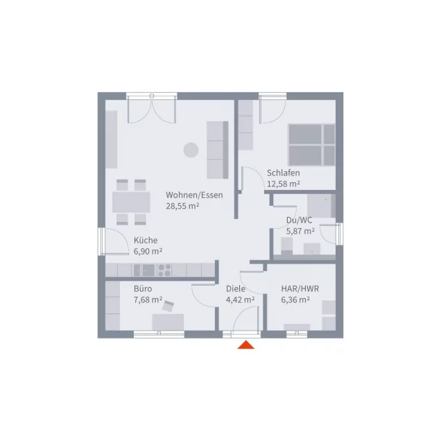 Der Tiny Single Bungalow 4 bietet eine ideale Lösung für komfortables Wohnen auf kleinem Raum. Mit einer Fläche von rund 72 m² kombiniert er Funktionalität und Stil. Im offenen Wohn-Ess-Koch-Bereich fließen Küche, Essbereich und Wohnzimmer ineinander und schaffen eine einladende Atmosphäre. Das Schlafzimmer dient als gemütlicher Rückzugsort mit ausreichend Platz für ein Bett und Stauraum. Im Badezimmer sorgt eine moderne Dusche für Komfort. Ein zusätzlicher Raum kann flexibel als Büro oder Kinderzimmer genutzt werden, ideal für Paare oder Einzelpersonen. Der Hauswirtschaftsraum bietet praktischen Stauraum für Haushaltsgeräte. Insgesamt ermöglicht der Bungalow ein stilvolles Leben auf kompaktem Raum.