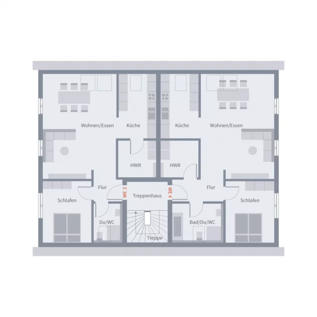 Dieses ansprechende Mehrfamilienhaus bietet vier großzügig geschnittene Wohneinheiten, die sich auf zwei Ebenen verteilen. Im Erdgeschoss befinden sich zwei Wohnungen, beide barrierefrei. Dies ermöglicht auch Menschen mit eingeschränkter Mobilität ein komfortables Wohnen. Die Erdgeschosswohnungen überzeugen durch ihre geräumige Aufteilung und den direkten Zugang zum Garten. Ebenfalls im Erdgeschoss befindet sich der gemeinschaftliche Haustechnikraum. Im Dachgeschoss erwarten die Bewohner zwei weitere großzügige Wohnungen, die durch ihre durchdachte Raumaufteilung und den Charme der Dachschrägen bestechen. Jede Wohneinheit bietet ausreichend Platz für individuelle Gestaltungsmöglichkeiten und garantiert ein angenehmes Wohnklima. Dieses Mehrfamilienhaus ist ideal für Familien oder Investoren, die Wert auf Komfort, Barrierefreiheit und eine durchdachte Struktur legen.
