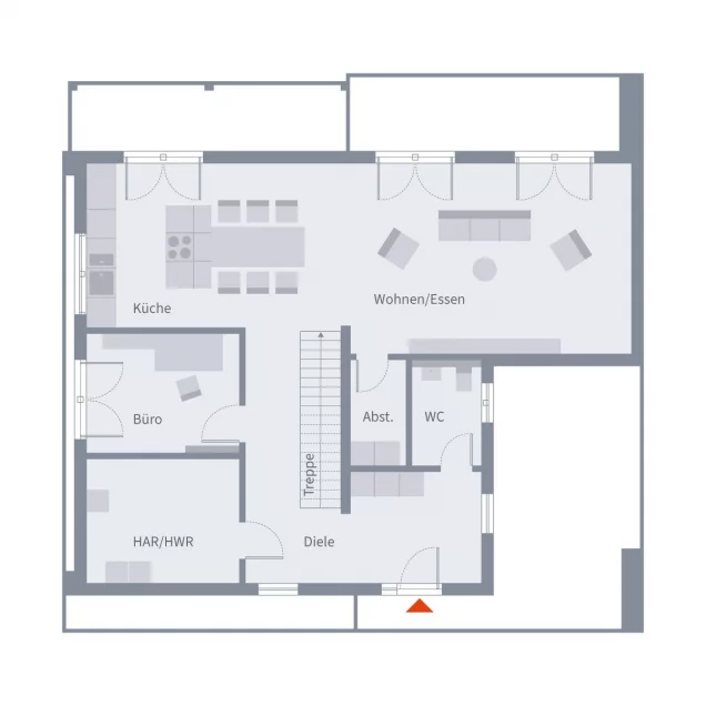 Man kommt ins Haus und steht im offenen Erdgeschoss.