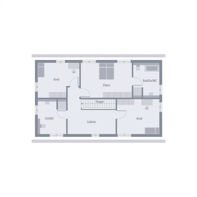 Ein wahres Platzwunder ist unser Design 7. Hier stehen Ihnen auf zwei Etagen 185 m² zur Verfügung. Zentrale Anlaufstelle im Erdgeschoss ist der mehr als 36 m² große Wohn-Ess-Bereich, an den auf der einen Seite eine großzügige Küche und auf der anderen Seite ein Arbeitszimmer anschließt. Ein geräumiger Hauswirtschaftsraum sowie ein kleines Gäste-WC befinden sich ebenfalls in diesem Stockwerk. Von der Diele führt eine Treppe direkt ins Highlight der ersten Etage: die Galerie, die beispielsweise als Bibliothek genutzt werden kann. Die knapp 17 m² bieten auch noch ausreichend Platz für eine Leseecke. Von der Galerie erreicht man eines der beiden Bäder, das Eltern-Schlafzimmer, an das sich ein separates Bad anschließt, sowie zwei weitere Zimmer, die als Kinder- oder Gästezimmer genutzt werden können.