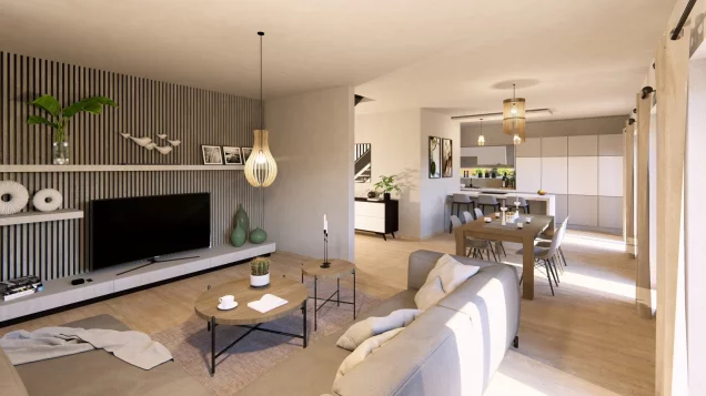 Groß, zeitlos-elegant und bis ins kleinste Detail durchdacht - das ist unsere Stadtvilla 16. Auf einer Fläche von mehr als 180 m2, verteilt auf zwei Ebenen, ist ausreichend Platz zum Leben, Arbeiten und Relaxen. Zentraler Ort der Begegnung für Familie und Freunde ist der rund 50 m² große Wohn-Ess-Koch-Bereich. Große Fensterfronten ermöglichen einen direkten Zugang zum Garten und sorgen für maximalen Lichteinfall. Besonders praktisch: Direkt an die Küche schließen sich eine Speisekammer sowie der große Hauswirtschaftsraum an. Außerdem im Erdgeschoss: komfortables Arbeitszimmer und Gäste-WC. Über den offenen Dielenbereich geht es ins Obergeschoss und damit in den Rückzugsort für die Familienmitglieder. Die Eltern verfügen hier über eine Wohlfühloase mit großem Schlafbereich, separatem Ankleidezimmer und sich unmittelbar anschließendem Badezimmer mit Wanne, Dusche und WC. Gegenüber: das Reich der Kinder. Die beiden geräumigen Zimmer werden durch ein eigenes Bad voneinander getrennt. Abgerundet wird das Raumangebot durch einen praktischen Abstellraum.