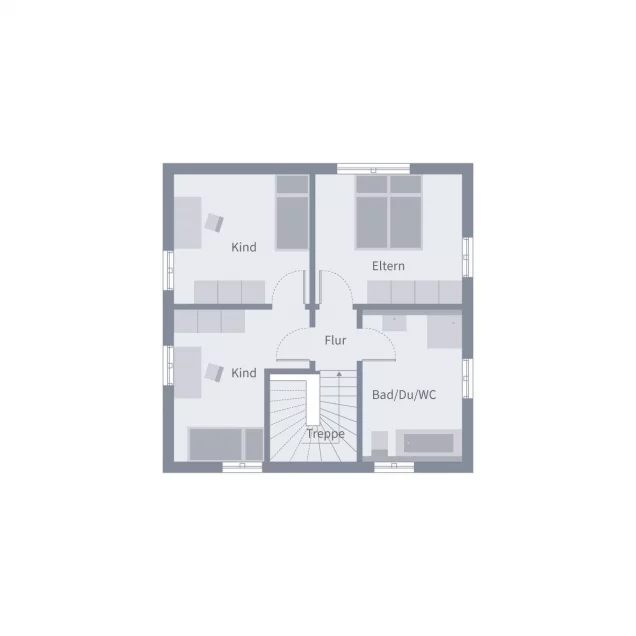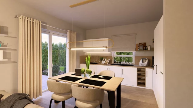 Die Stadtvilla 9 nutzt ihre 107 m² perfekt - mit einem Grundriss, der modernes Familienleben leicht macht. Im Erdgeschoss öffnet sich der helle Wohnbereich mit Küche und Essplatz zu einem Raum, in dem der Alltag fließt: gemeinsam frühstücken, Hausaufgaben begleiten, abends entspannen. Große Fenster holen Licht und Garten hinein. Ein Gäste-WC und der praktische Hauswirtschaftsraum sorgen für Ordnung im Alltag. Oben findet jeder seinen Platz: ein Elternzimmer als Rückzugsort, zwei Kinderzimmer zum Spielen und Träumen sowie ein Familienbad, das den Tag mit Leichtigkeit beginnen lässt.