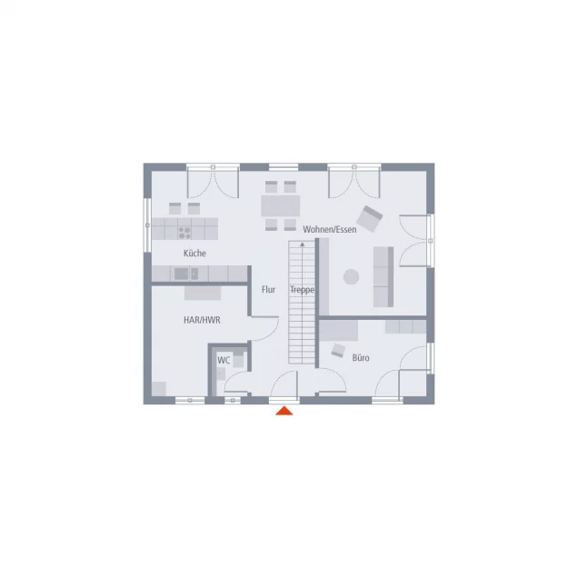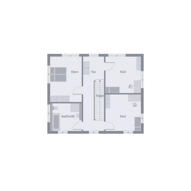 Die Stadtvilla 10 zeigt, wie modern und wohnlich ein Walmdach sein kann. Es verleiht dem Haus eine elegante Ausstrahlung - und sorgt ganz praktisch dafür, dass im Obergeschoss keine Dachschrägen den Raum begrenzen. Auf rund 78 m² im Erdgeschoss treffen Gemeinschaft und Funktionalität aufeinander: Der offene Wohn-, Ess- und Kochbereich öffnet sich zur Terrasse und holt das Grün direkt ins Haus. Büro, Hauswirtschaftsraum und Gäste-WC liegen praktisch auf der Eingangsseite. Oben finden Eltern und Kinder ihren Rückzugsort: zwei gleich große Kinderzimmer, ein großzügiges Bad und ein Elternbereich, der Ruhe ausstrahlt. Ein Zuhause mit Stil und Herz.