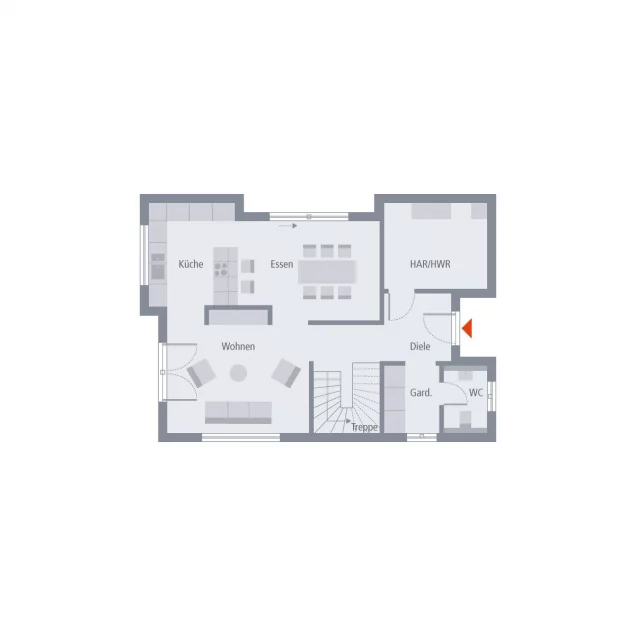 Der überdachte Eingang führt direkt in den großzügigen Wohn-Ess-Koch-Bereich. Versetzte Ebenen sorgen für Dynamik und Weite. Hauswirtschaftsraum, Garderobe und Gäste-WC - funktional, durchdacht, ohne Kompromisse.