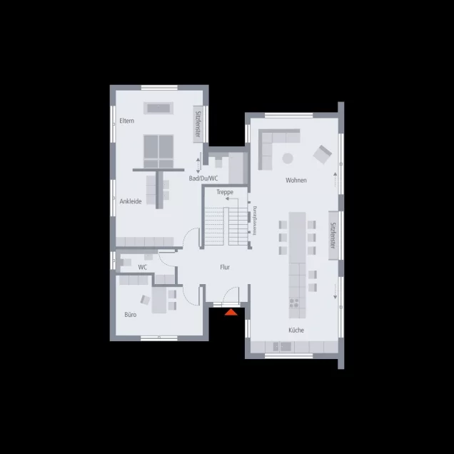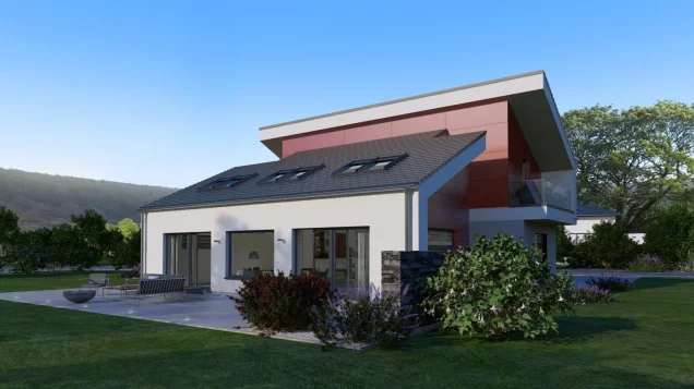 Bei unserem Musterhaus Simmern trifft eine außergewöhnliche Fassadengestaltung auf ein Wohnerlebnis der besonderen Art. Die Außengestaltung wird geprägt durch das versetzte Pultdach und den Rückversatz eines Bauteils, der durch zwei überdachte Balkone nicht nur optische, sondern auch echte wohnliche Mehrwerte mit sich bringt. Diese Mehrwerte setzen sich auch im Inneren fort. Attraktiver Mittelpunkt ist der mehr als 55 m² große Wohn-Ess-Koch-Bereich, der mit zahlreichen Fensterelementen und mit den hohen Decken punktet und dadurch noch größer wirkt. Auch der Rückzugsort der Eltern befindet sich Parterre: mit Schlafbereich, Ankleidezimmer, Badezimmer und separater Toilette. Büro und Gäste-WC runden das Raumangebot im Erdgeschoss ab. Oben: das Reich der Kinder. Highlights hier sind die beiden Balkone und die große Galerie. Musterhaus Simmern - mehr als Wohnen.