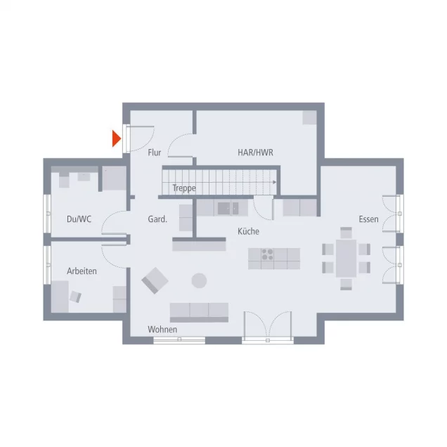 Hell, elegant und praktisch, so präsentiert sich das TownHouse 13.1 mit klassischem Satteldach. Große Fensterfronten sorgen auf allen Etagen für viel Lichteinfall und damit für eine besondere Wohlfühl-Atmosphäre. Das trifft auch auf den Wohn-Koch-Essbereich im Erdgeschoss zu. Hier ist ausreichend Platz für eine Kochinsel, die Wohn- und Essbereich optisch voneinander abtrennt. Außerdem im Erdgeschoss: Dusch-WC, Arbeitszimmer und Hauswirtschaftsraum.