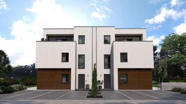 Vier Wohneinheiten, die nichts an Komfort und architektonischen Highlights vermissen lassen - das ist unser Zinshaus 7. Das dreigeschossige Gebäude mit modernem Flachdach bietet viele Optionen: Komplettvermietung für eine maximale Rendite oder Teilvermietung mit der Möglichkeit, eine der Wohneinheiten selbst zu beziehen. Jeweils zwei Wohnungen des Doppelhauses sind baugleich. Die beiden Einliegerwohnungen parterre sind über einen gemeinsam genutzten Flur mit separatem HWR erreichbar und vereinen alles, was Singles oder Paare zum komfortablen Wohnen benötigen: ein großes und lichtdurchflutetes Wohn-Ess-Zimmer, separate Küche, Schlafzimmer sowie Bad. Einen loftähnlichen Charakter weisen die beiden darüberliegenden Wohnungen auf, die sich jeweils über zwei Etagen erstrecken. Den Mittelpunkt des ersten Stockwerks bildet der geräumige Essbereich, an den sich die Küche direkt anschließt. Außerdem in dieser Etage: ein großes Kinderzimmer, Badezimmer sowie ein über den gemeinsam genutzten Flur zugänglicher HWR. Unterm Dach: ein großes Wohnzimmer mit Zugang zu zwei großen Balkonen sowie das Reich der Eltern - mit Schlafbereich, Ankleide- und Badezimmer.