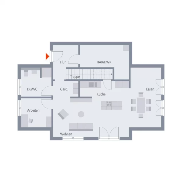 Der Wohn-Koch-Essbereich ist so großzügig, dass locker eine Kochinsel Platz findet. Kochen, quatschen, genießen - alles gleichzeitig und mit Style. Dazu gibt’s ein Dusch-WC, ein Arbeitszimmer und einen Hauswirtschaftsraum, die beweisen: Praktisch kann verdammt elegant sein.
