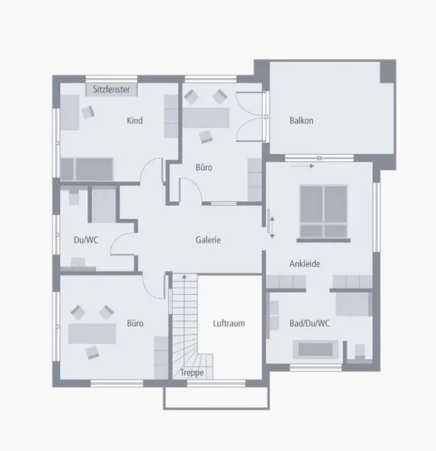 In der Eltern-Suite im Dachgeschoss verbindet die Ankleide Schlafraum und Badezimmer. Kinder oder Gäste finden hier ebenfalls ihren Platz. Und auch auf Büro und zusätzliches Duschbad muss nicht verzichtet werden. So geht wohnen!